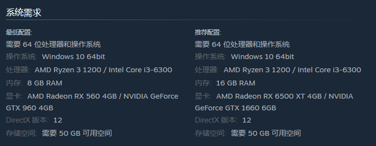配置需求方面,这款游戏最低需要 AMD R3 1200 或英特尔酷睿 i3-6300 处理器,AMD Radeon RX 560 4GB 或 NVIDIA GeForce GTX 960 4GB 显卡,推荐使用 RX 6500 XT 或 GTX 1660 6GB 显卡。