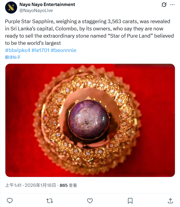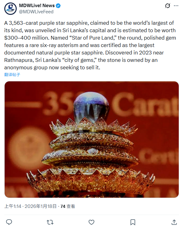 IT之家 1 月 18 日消息,斯里兰卡于当地时间周六在首都科伦坡公开展示了一枚极为罕见的紫色星光蓝宝石。该宝石重达 3563 克拉,号称是目前地球上已知最大的天然紫色星光蓝宝石。
