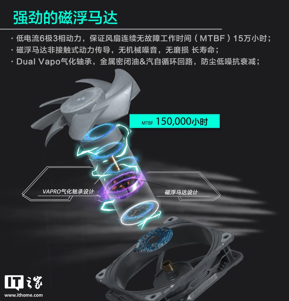 参数方面,这款风扇配备强力磁浮马达,采用低电流 6 极 3 相动力设计,保证风扇连续无故障工作时间(MTBF)达 15 万小时,搭载 Dual Vapo 气化轴承,拥有金属密闭油、汽自循环回路,实现防尘低噪抗衰减。