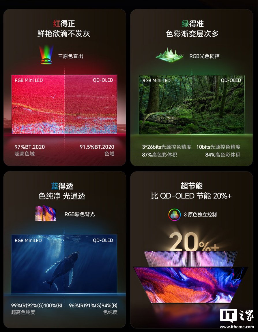 该电视搭载 RGB-Mini LED 三维控色液晶显示技术,支持三原色直出、RGB 光色同控、RGB 彩色背光,号称比 QD-OLED 节能 20%+;支持 10752 控色分区,XDR Pro 8000nits 亮度。