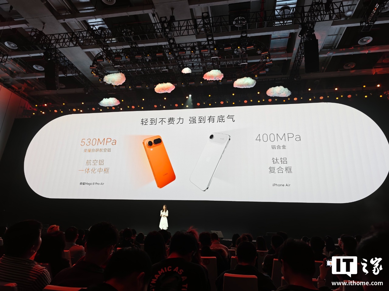 荣耀 Magic8 Pro Air 在仅 6.1mm 的机身中,装下了 5500mAh 青海湖电池,能量密度高达 917Wh/L,支持 80W 有线快充、50W 无线快充。新机采用航空铝一体化中框,强度达到了 530MPa。