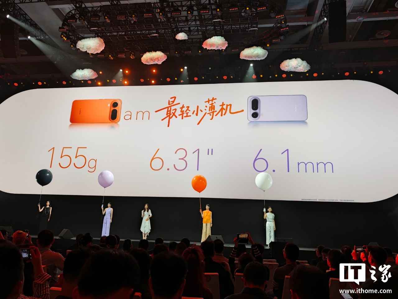 作为年度最轻旗舰手机,重量仅 155g,机身厚度仅 6.1mm。新机配备 6.31 英寸 OLED 显示屏,实现 1.08mm 四边等窄。新品采用豪车同款的 7 涂 7 烤光感叠涂工艺,金属缎光质感,提供仙紫、轻橙、羽白、影黑四款配色。
