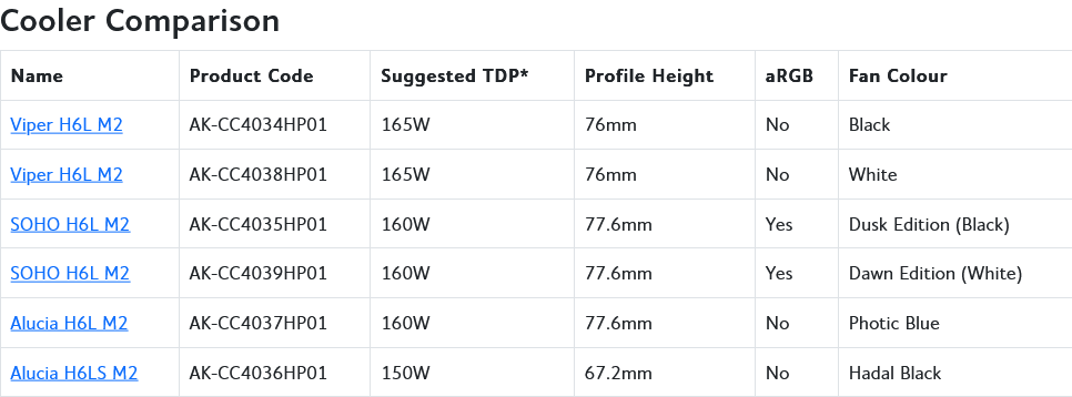 VIPER H6L M2 高 76mm,标称 TDP 165W,提供黑色与白色版本。