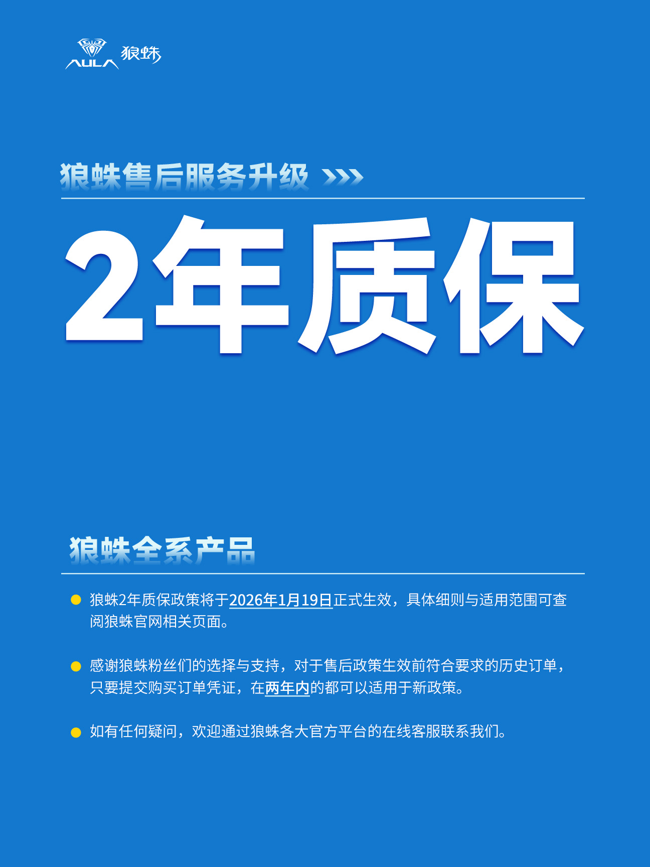 IT之家 1 月 20 日消息,外设品牌狼蛛 AULA 昨日下午宣布,即日起其全系产品售后全面升级至支持 2 年质保。
