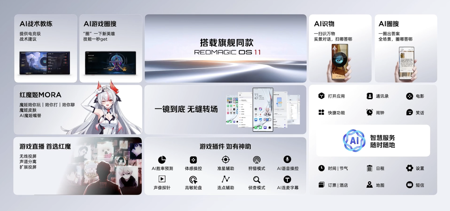 其他方面,该机搭载 7000mAh 电池(支持 120W 有线充电、旁路充电),内置 REDMAGIC OS 11.0 系统,内置 PC 模拟器,同时拥有 AI 圈搜、AI 识物功能,支持图片找物、全屏翻译、实景对话等功能,还带有 AI 游戏圈搜、AI 战术教练等功能,能够在游戏过程中给用户出谋划策。