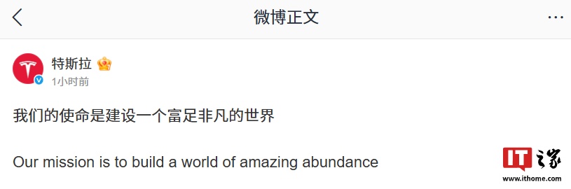 IT之家 1 月 21 日消息,特斯拉官方微博今日宣布,其使命是建设一个富足非凡的世界。