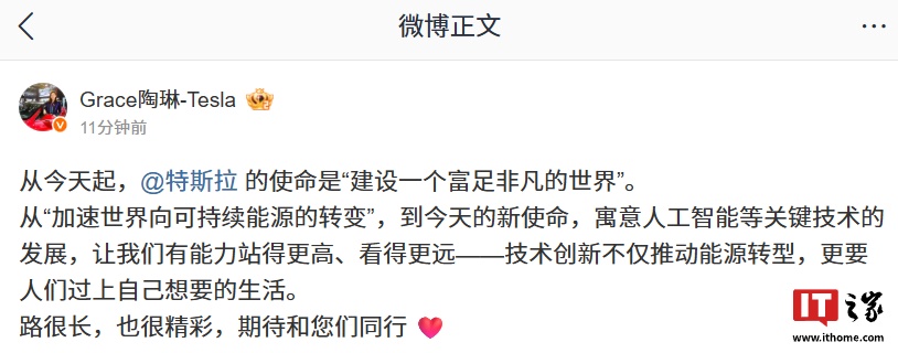 IT之家注意到,特斯拉公司副总裁陶琳今日发文对新使命进行解释。她表示: