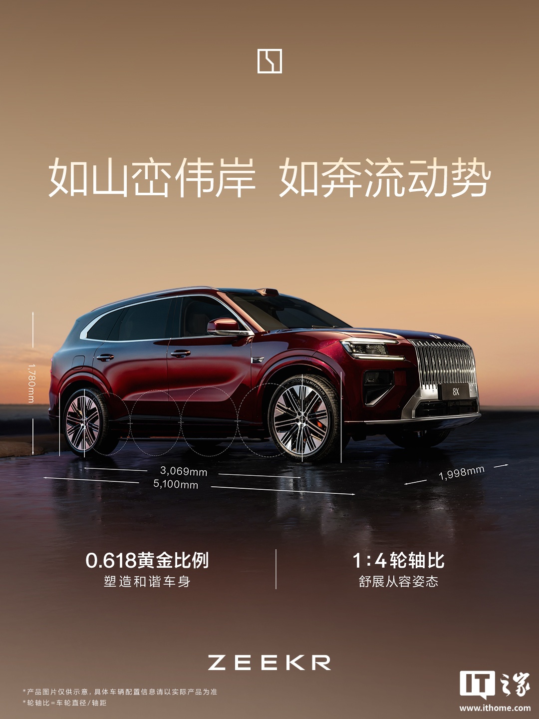 据介绍,极氪 8X 采用 0.618 黄金比例设计、拥有 1:4 轮轴比,尺寸为 5100×1998×1780mm、轴距 3069mm。