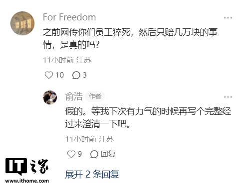 IT之家注意到,俞浩还在评论区回复了“之前网传你们员工猝死,然后只赔几万块的事情,是真的吗?”,表示:“假的。等我下次有力气的时候再写个完整经过来澄清一下吧。”