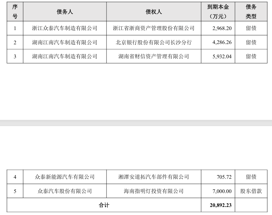 此外,众泰汽车股份有限公司当日发布关于部分债务到期的公告,截至公告日,该公司及下属公司累计到期未偿还债务本金合计为 20,892.23 万元。