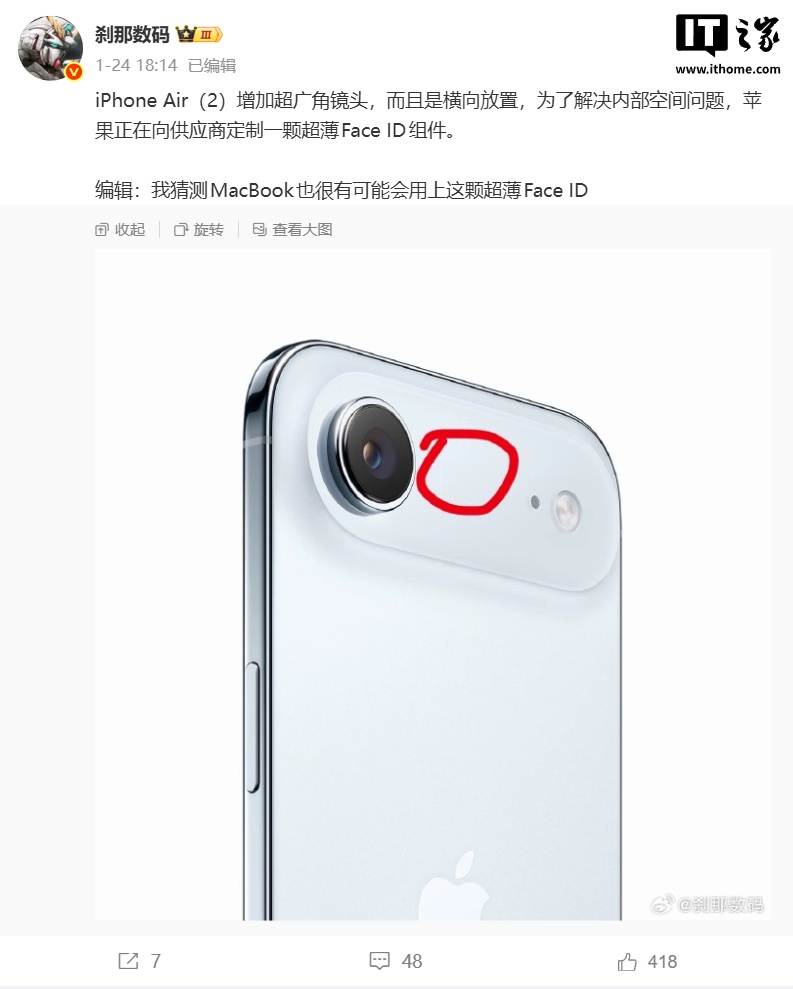 IT之家 1 月 27 日消息,博主 @刹那数码 1 月 24 日爆料,iPhone Air(2)增加超广角镜头,而且是横向放置,为了解决内部空间问题,苹果正在向供应商定制一颗超薄 Face ID 组件。