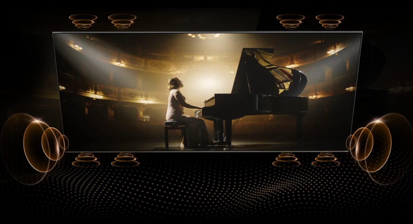 设计方面,这款显示器带有一体式 Soundbar,采用 4.1.2 声道设计,共有 11 个扬声器单元,支持杜比全景声,搭载 Google TV 操作系统。