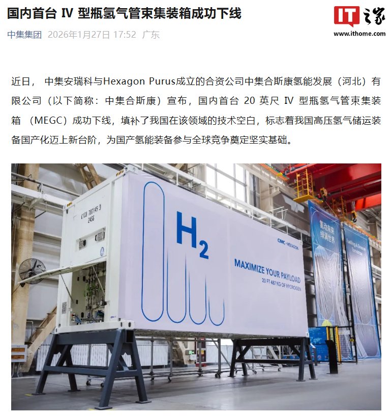 IT之家 1 月 27 日消息,中集集团今日宣布,国内首台 20 英尺 Ⅳ 型瓶氢气管束集装箱(MEGC)成功下线,填补了我国在该领域的技术空白,标志着我国高压氢气储运装备国产化迈上新台阶,为国产氢能装备参与全球竞争奠定坚实基础。