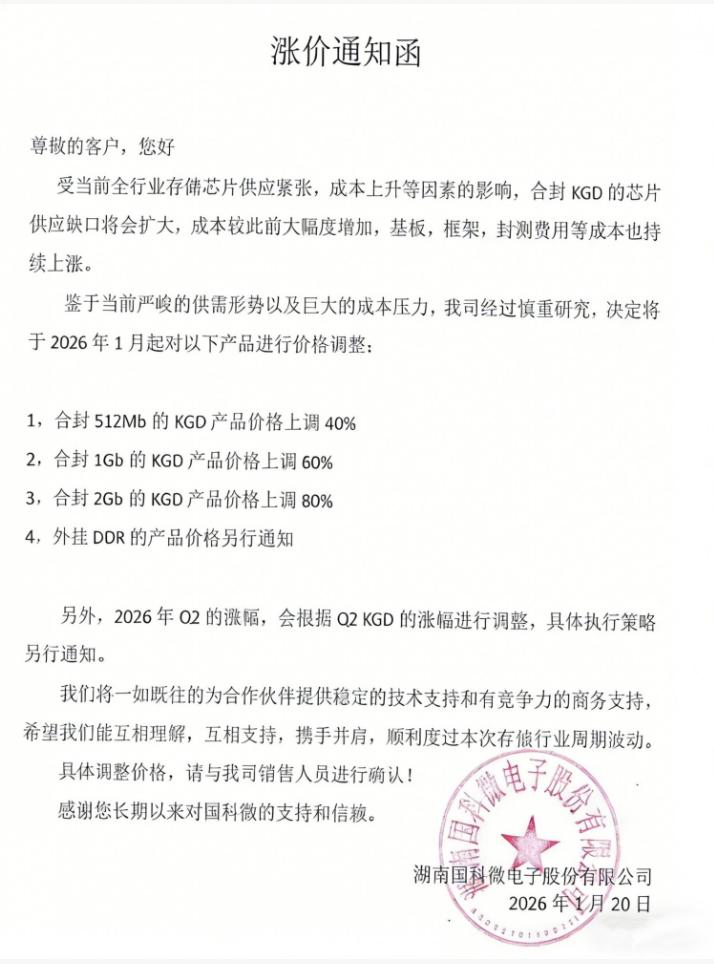 另据上证报,从产业链获悉,另一家半导体公司国科微也对客户发出涨价函,称受全行业存储芯片供应紧张及成本持续上升的影响,合封 KGD 芯片的供应缺口预计将进一步扩大,相关成本已大幅增加。此外,基板、框架、封测等环节费用亦不断上涨。面对严峻的供需形势与成本压力,公司经慎重研究,决定自 2026 年 1 月起对部分产品价格进行调整,具体包括: