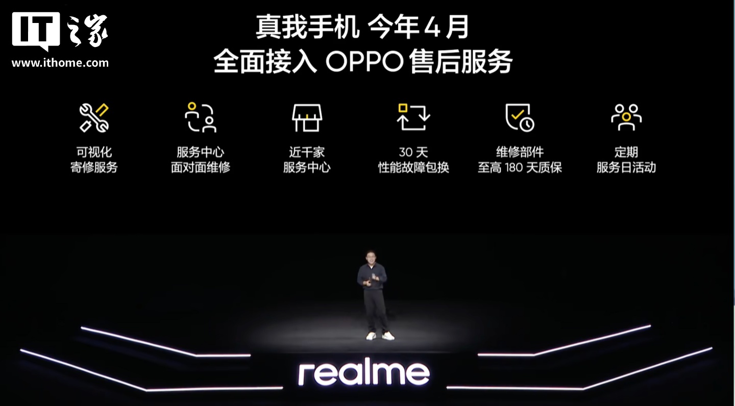据介绍,在接入 OPPO 售后服务后,用户持 realme 真我手机可享 OPPO 门店可视化寄修服务、服务中心面对面维修、近千家维修中心、30 天性能故障包换、维修部件至高 180 天质保、定期服务日活动。
