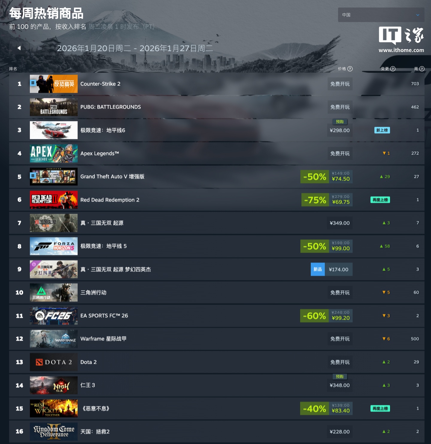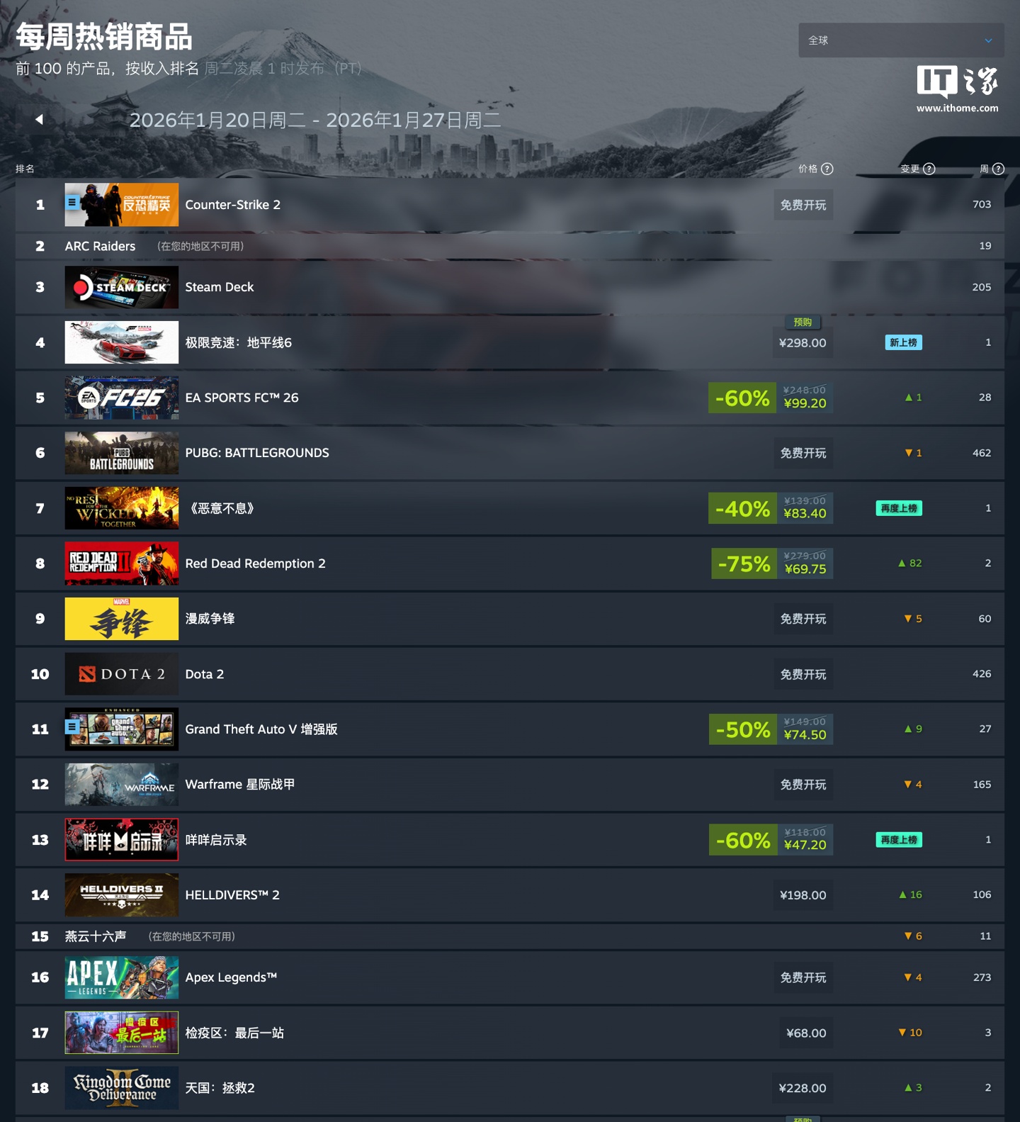 IT之家 1 月 28 日消息,Steam 平台现已公布最新一期游戏销量排行榜(2026 年 1 月 20 日-2026 年 1 月 27 日,无免费游戏),全球榜单中,本周的冠军依旧是由《ARC Raiders》,《极限竞速:地平线 6》位列第二、《GTA 5 增强版》回归榜单。