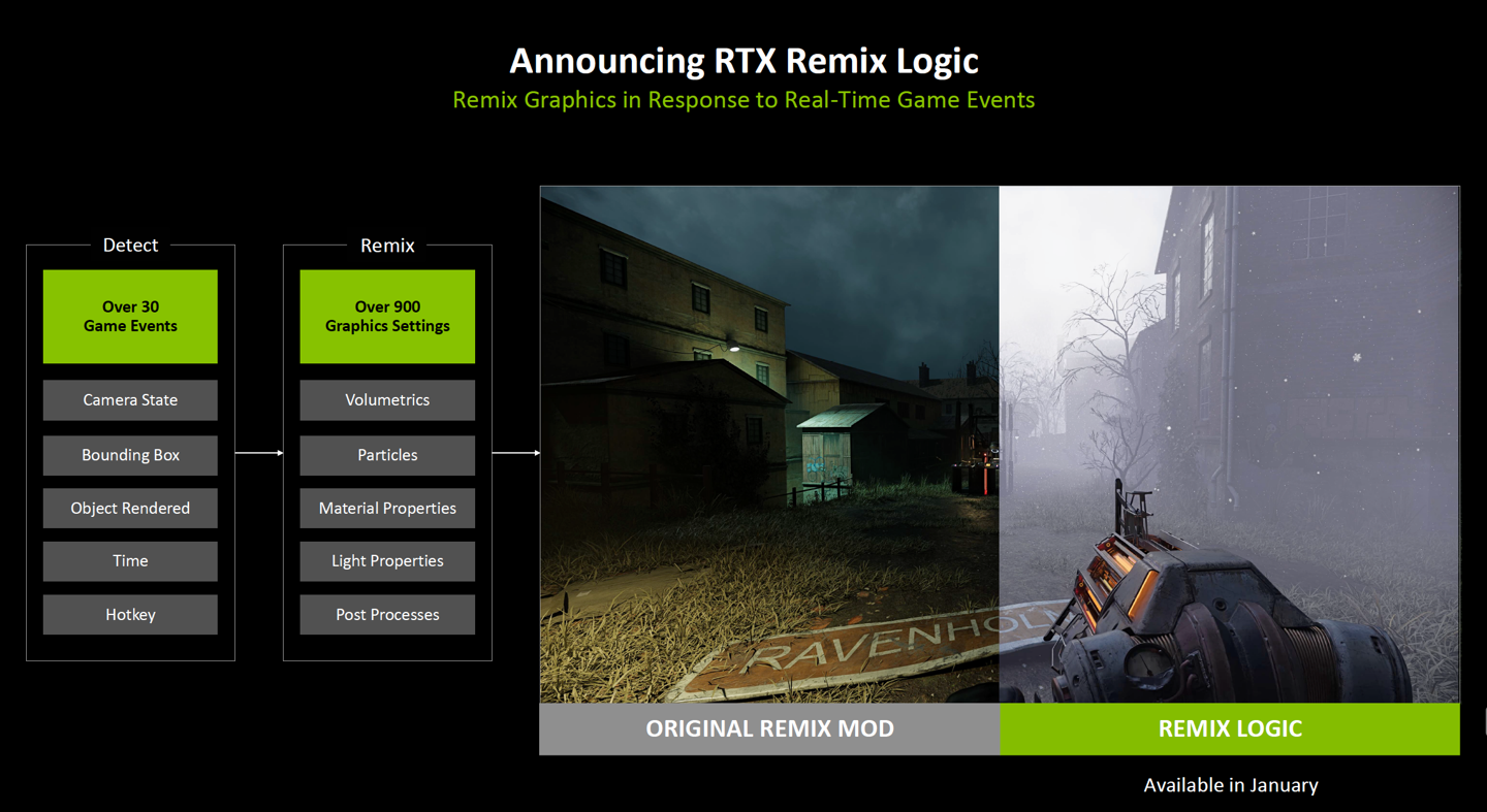 IT之家 1 月 28 日消息,英伟达昨日(1 月 27 日)更新 NVIDIA App,正式推出 RTX Remix Logic,让 MOD 作者不访问源代码的情况下,根据实时游戏事件(如玩家位置、按键输入)动态触发图形特效。