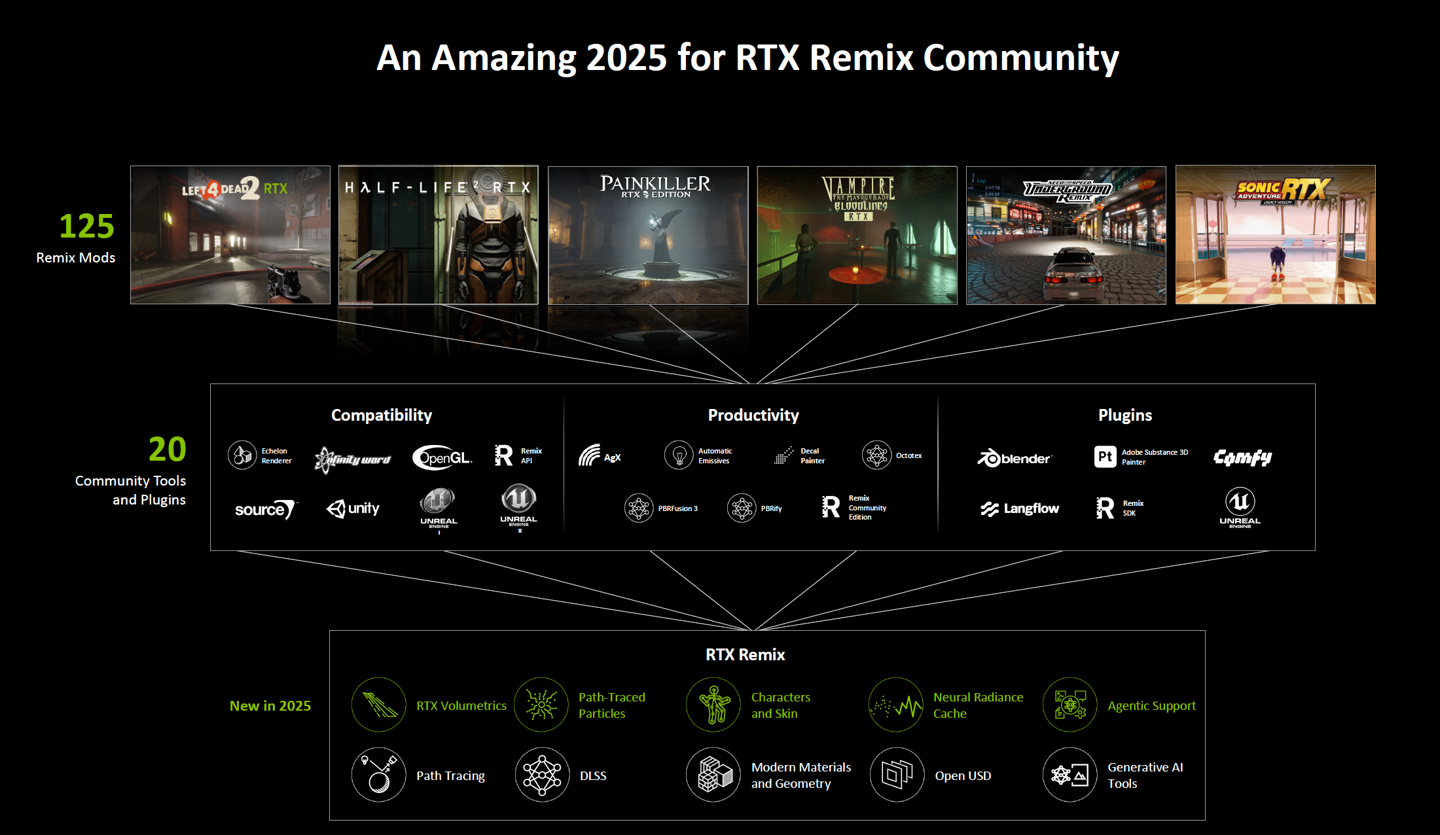 官方数据显示,目前已有超过 165 款经典 PC 游戏支持 RTX Remix Logic 技术,为老游戏高清重制开辟了全新赛道。