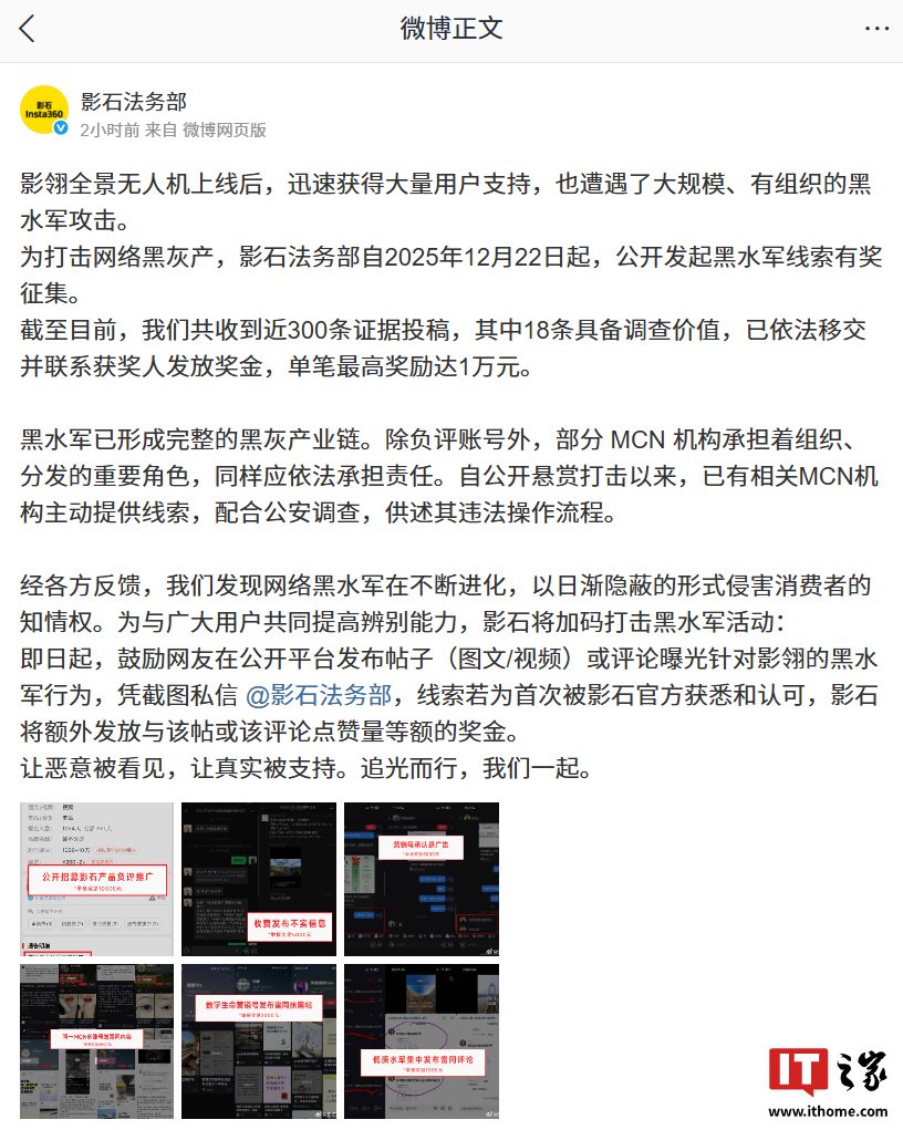 IT之家 1 月 28 日消息,影石法务部昨日发文称,发现网络黑水军在不断进化,将加码打击黑水军活动,鼓励网友在公开平台发布帖子或评论曝光针对影翎的黑水军行为,线索若为首次被影石官方获悉和认可,将额外发放与该帖或该评论点赞量等额的奖金。
