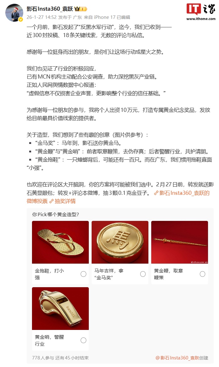 IT之家注意到,影石中国区负责人袁跃也发文宣布,将个人出资 10 万元,打造专属黄金纪念奖品,发放给目前最具价值线索的提供者。目前纪念品造型创意包括:金拖鞋、“金马奖”、黄金鞭、黄金哨。