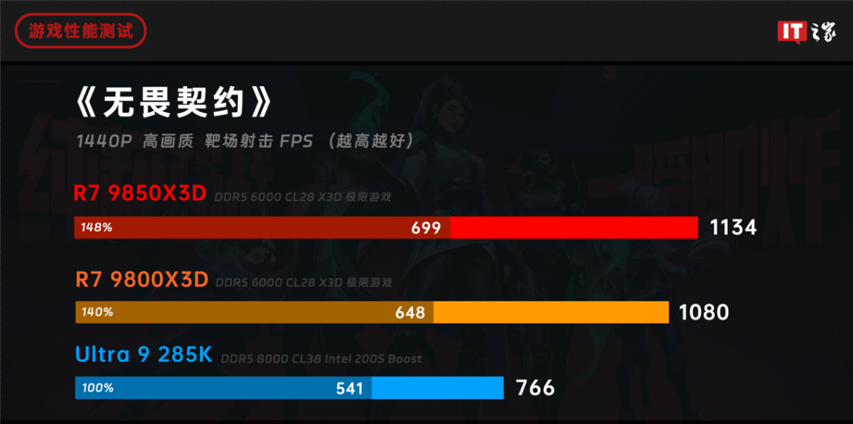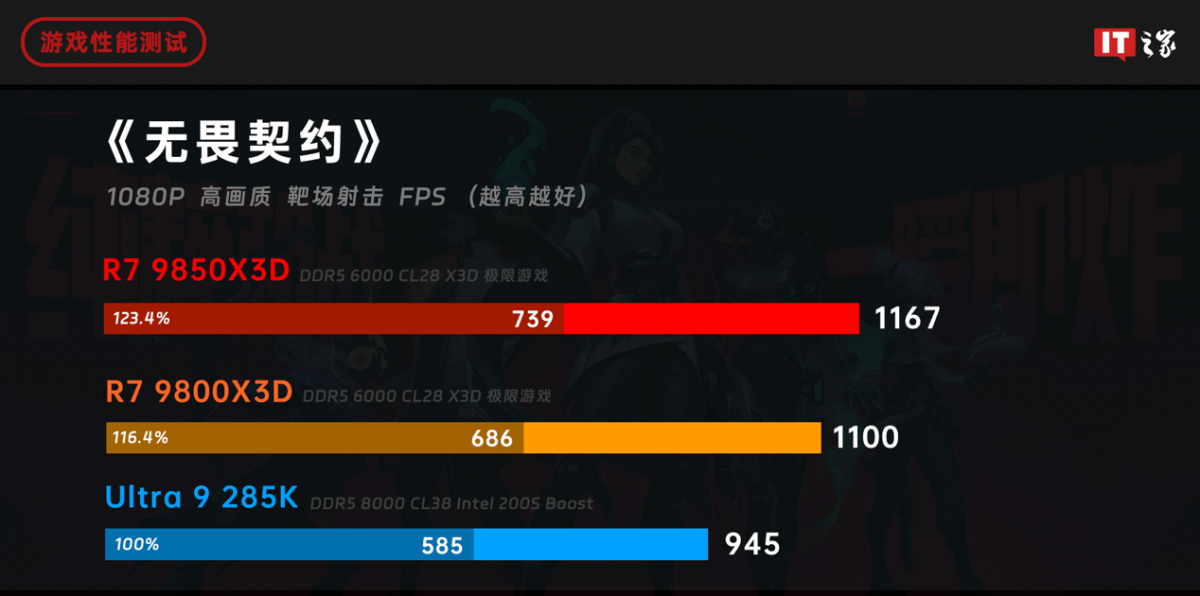 在 1080P 分辨率 + 高画质预设下,两颗锐龙处理器都顺利跑到了千帧以上的游戏平均帧数,就连 1% Low 也有六七百帧。即使实战中帧数并没有这么高,但足够证明锐龙 7 9850X3D 是名副其实的千帧电竞神 U。酷睿 Ultra 9 285K 距离千帧只差一点,非常可惜。如果以酷睿 Ultra 9 285K 的成绩为 100% 基准,那么锐龙 7 9800X3D 和锐龙 7 9850X3D 的性能分别领先了 16% 和 20%,而锐龙 7 9850X3D 相比锐龙 7 9800X3D 强了 6% 左右,在大基数面前,这个优势也非常可观。