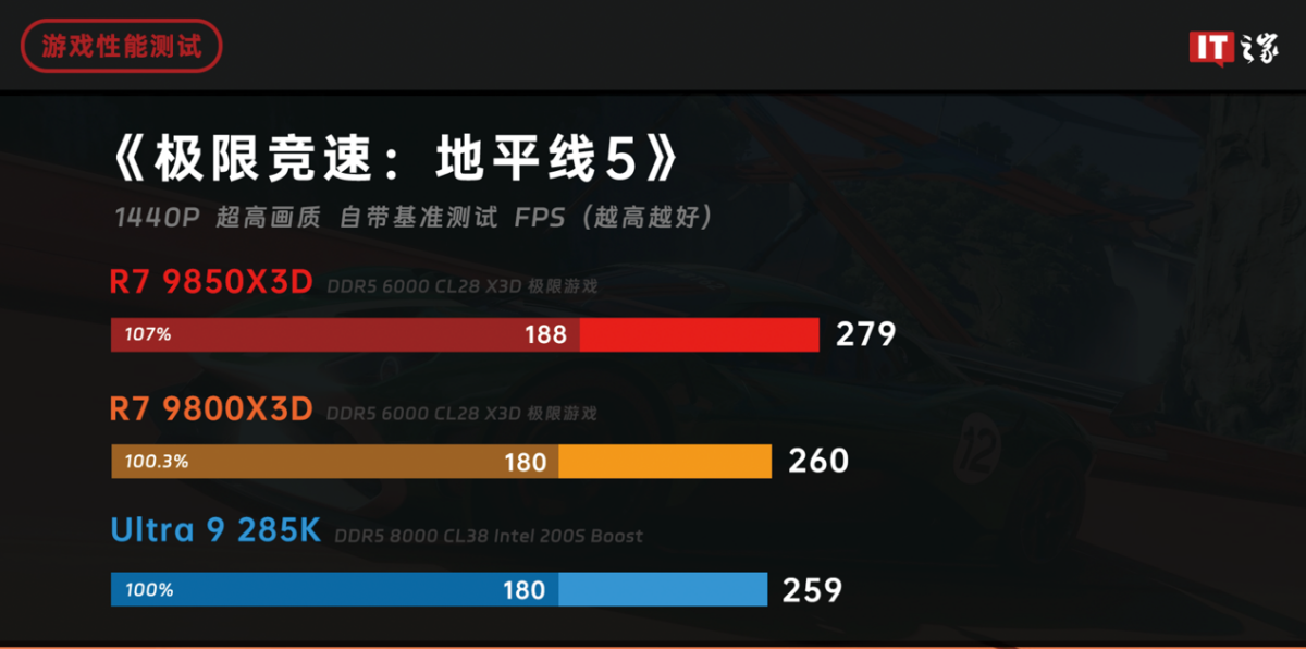 来到 2K 分辨率下,锐龙 7 9850X3D 的优势略有缩小,但依旧有 7% 的性能领先,1% Low 则领先了 4.4%。今年 5 月份《极限竞速:地平线 6》也要来了,对于硬核赛车玩家来说,锐龙 7 9850X3D 可能就是最佳处理器选择。