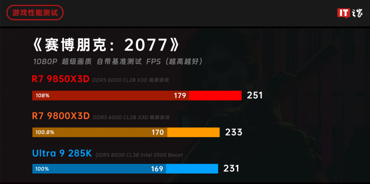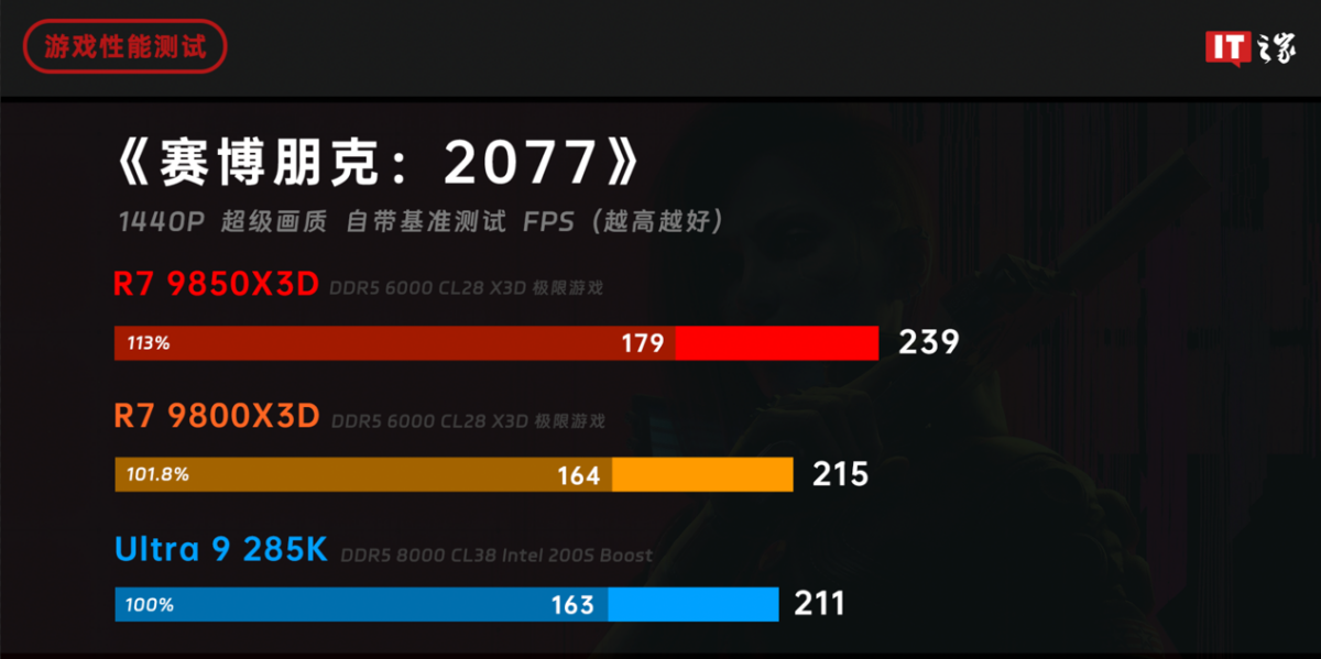 《赛博朋克:2077》在锐龙 7 9800X3D 的评测中,也是和酷睿 Ultra 9 285K 难分伯仲,不过随着锐龙 7 9850X3D 的加入,局面发生了改变。