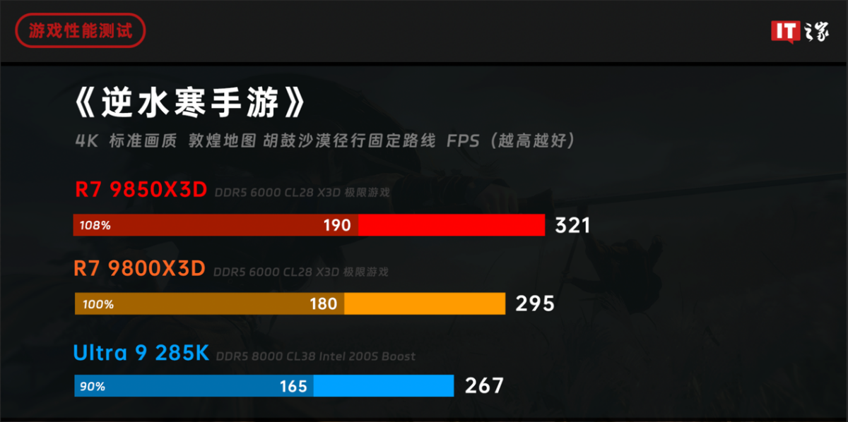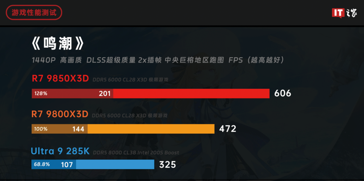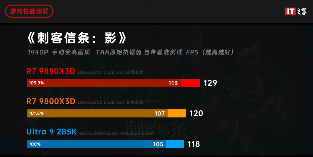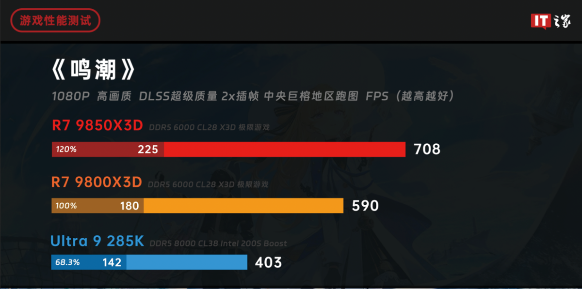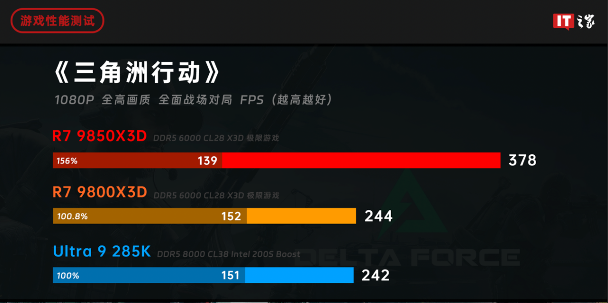 锐龙 7 9800X3D 和酷睿 Ultra 9 285K 的性能依旧处于同一水平,无论是游戏平均帧数还是 1% Low,而锐龙 7 9850X3D 的性能快了 8%,1% Low 也有 5% 的提升。