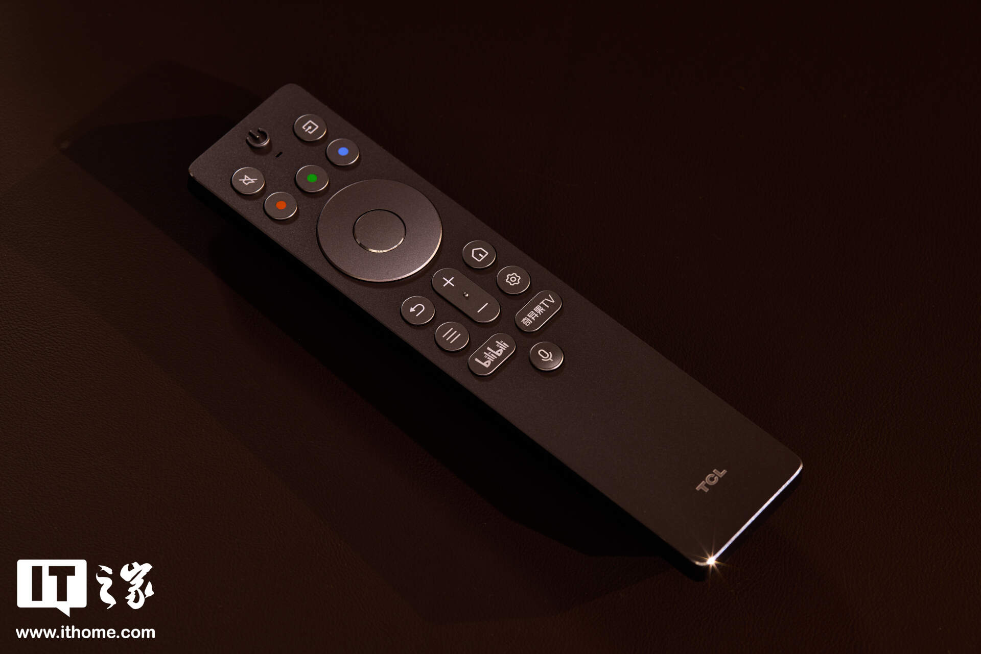 遥控器采用金属面板材质,配备感应背光功能,同时设计有自定义快捷键、B站与奇异果专属直达键,侧边按键可调节亮度及快速切换图像模式。