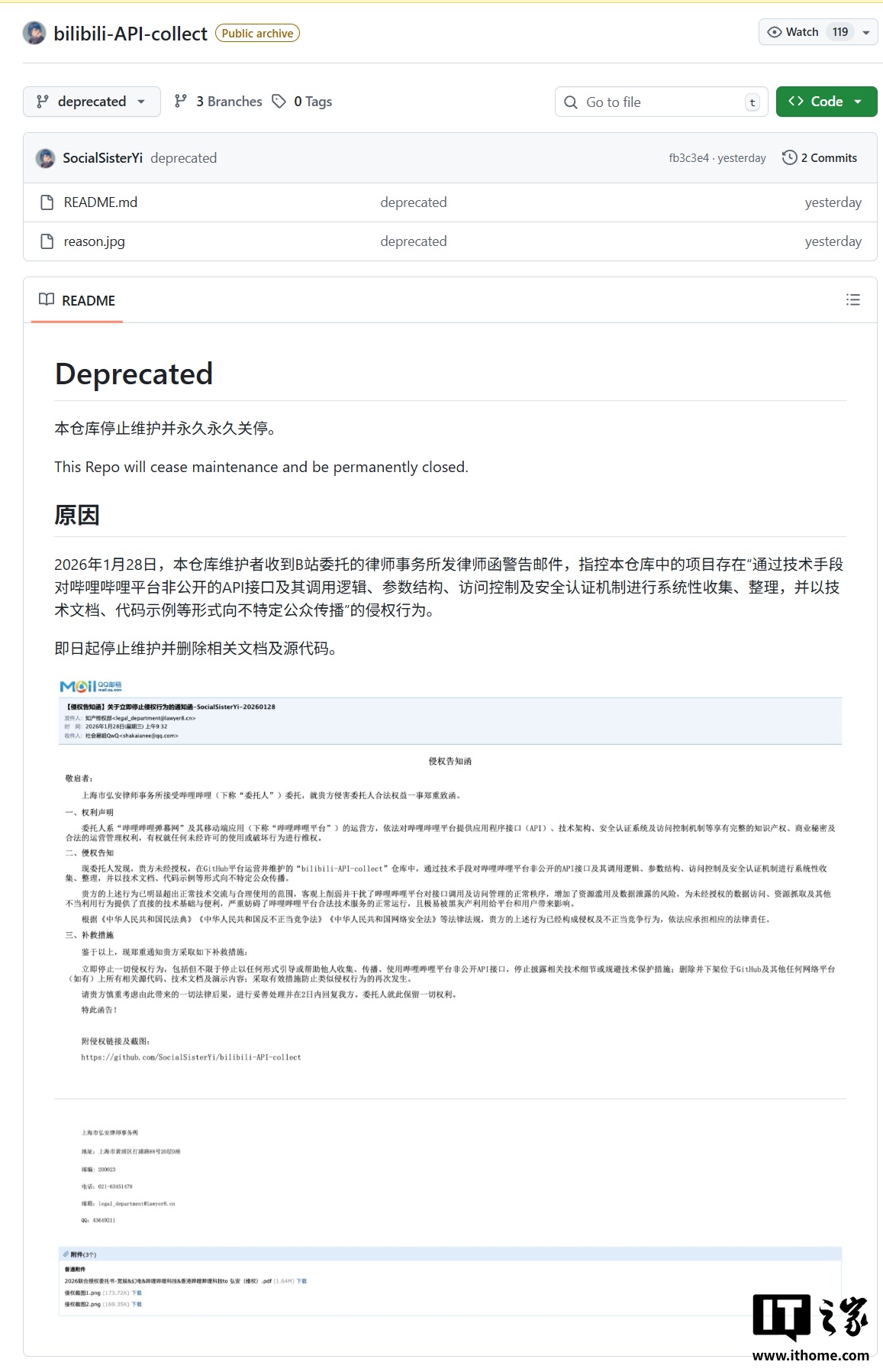 bilibili-API-collect 开发者昨日(1 月 28 日)突然发布消息,表示该仓库停止维护并永久关停。