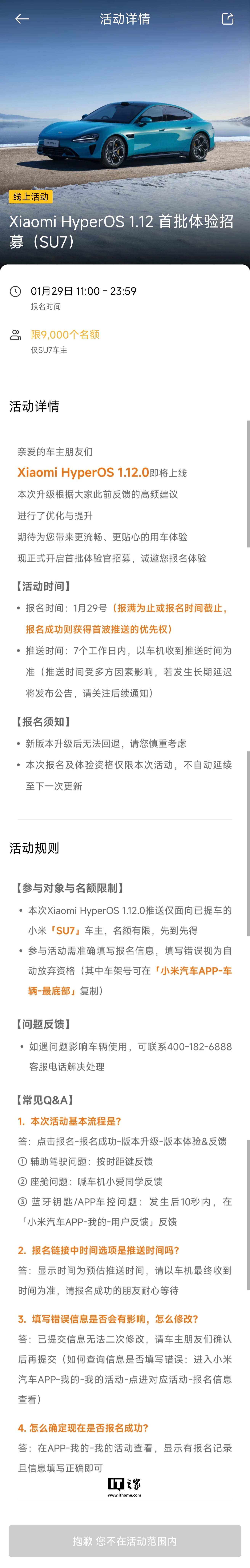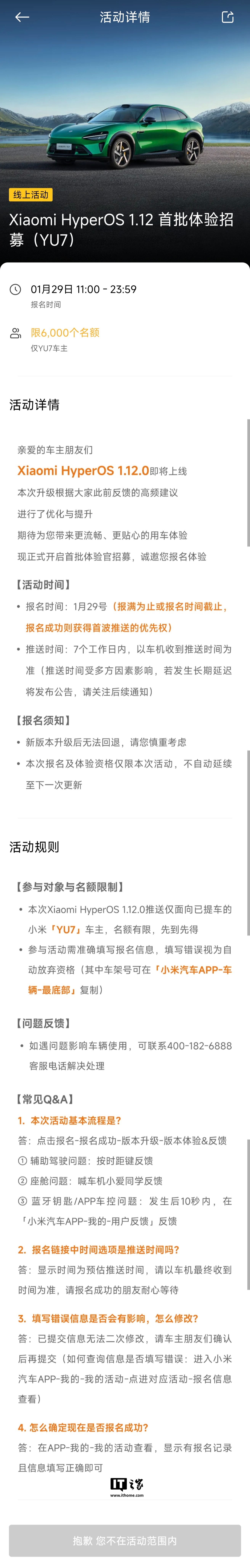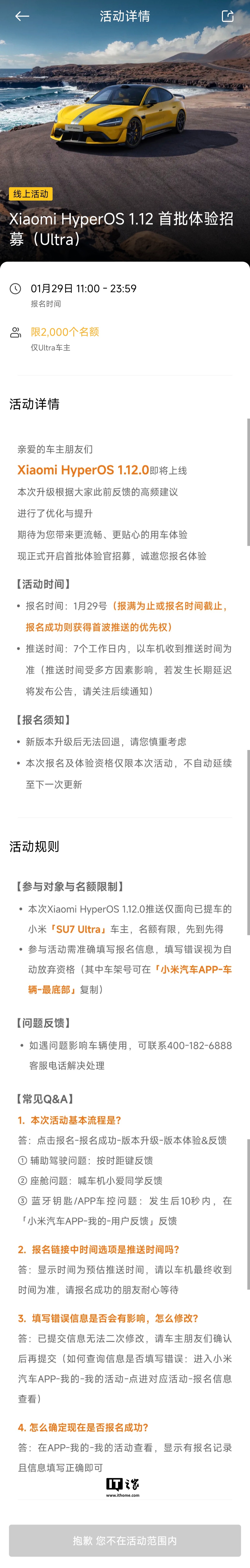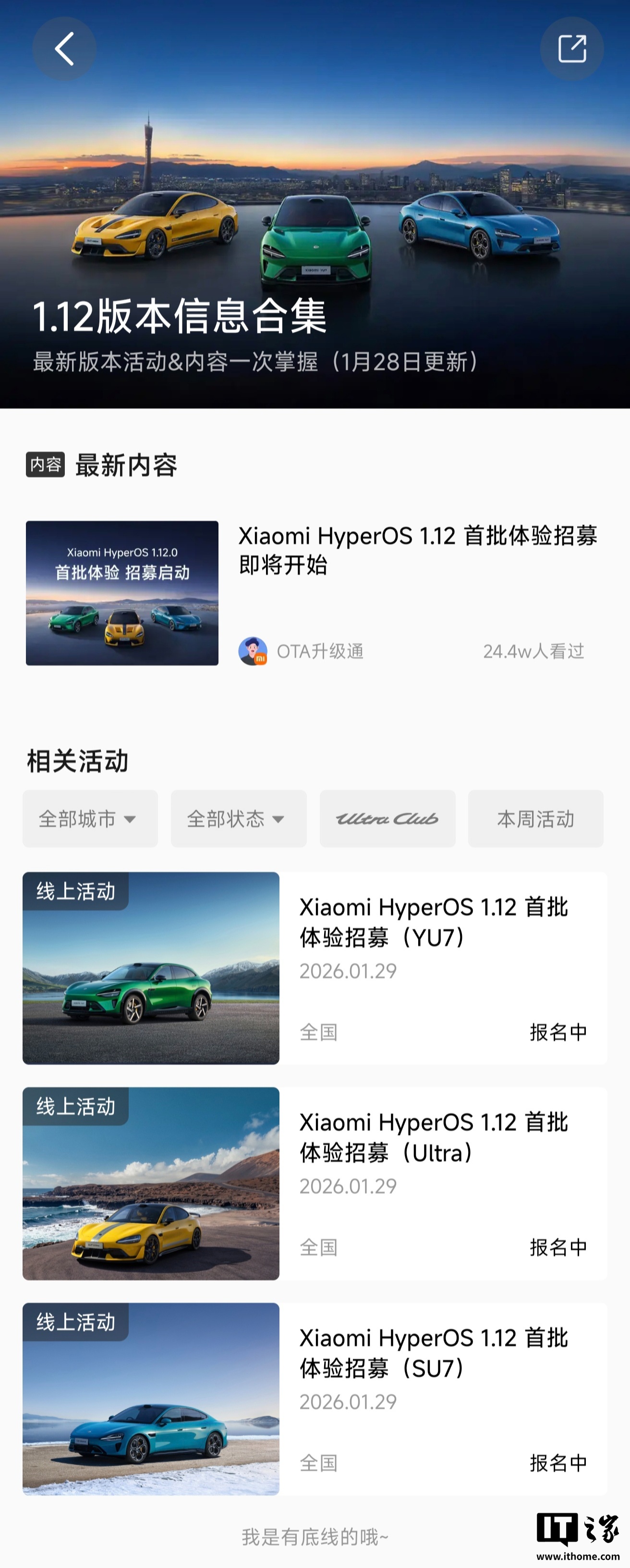 IT之家 1 月 29 日消息,小米汽车 App 显示,SU7 / YU7 / SU7 Ultra 车型已于今日开启了 HyperOS 1.12 版本体验招募(报名时间:1 月 29 日 11:00 -23:59)。