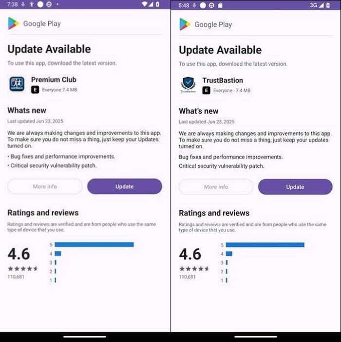 用户安装后,TrustBastion 会立即弹出一个伪装成 Google Play 风格的强制更新提示。实际上,该应用并不直接包含恶意代码,而是连接服务器,将用户重定向至 Hugging Face 的数据集仓库,下载真正的恶意 APK 载荷。