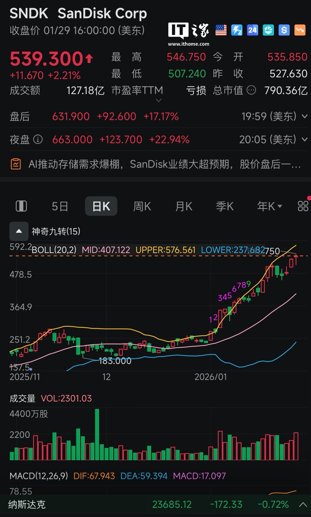 受此消息影响,闪迪美股周四盘后涨超 17%,甚至夜盘一度涨近 23%,市值超 790.36 亿美元(IT之家注:现汇率约合 5494.91 亿元人民币)。