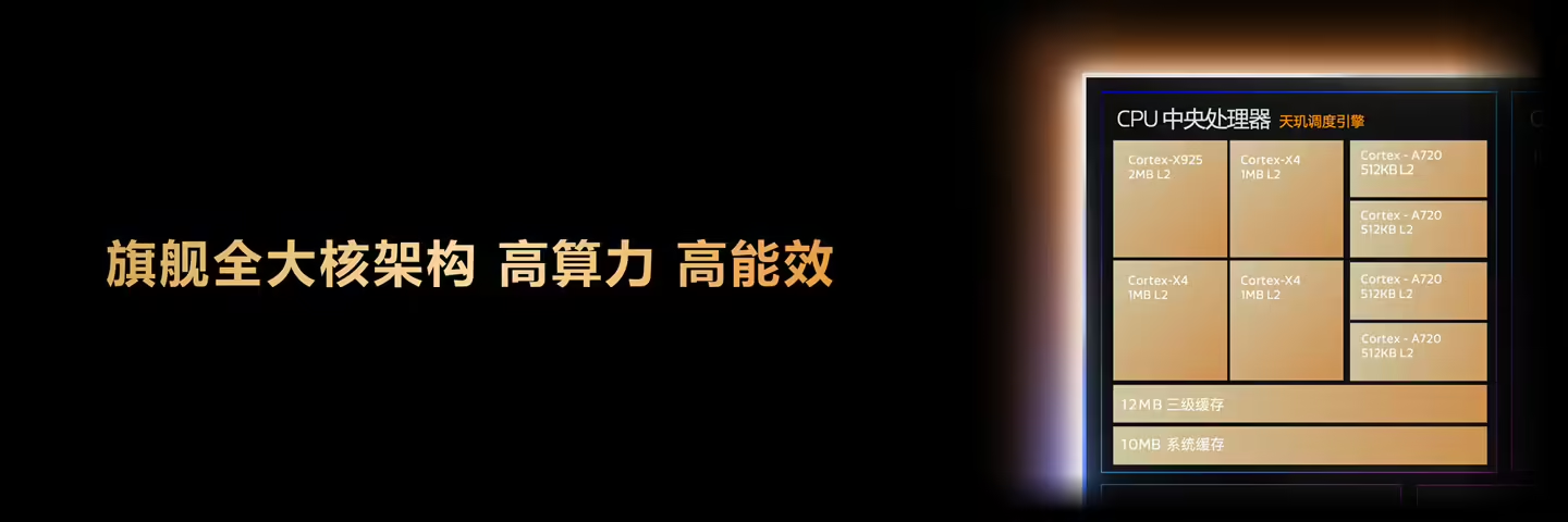 在架构设计上,它延续并升级了“全大核”理念,CPU 部分由 1 颗主频高达 3.73GHz 的 Cortex-X925 超大核,搭配 3 颗 3.3GHz 的 Cortex-X4 超大核,以及 4 颗 2.4GHz 的 Cortex-A720 大核组成。