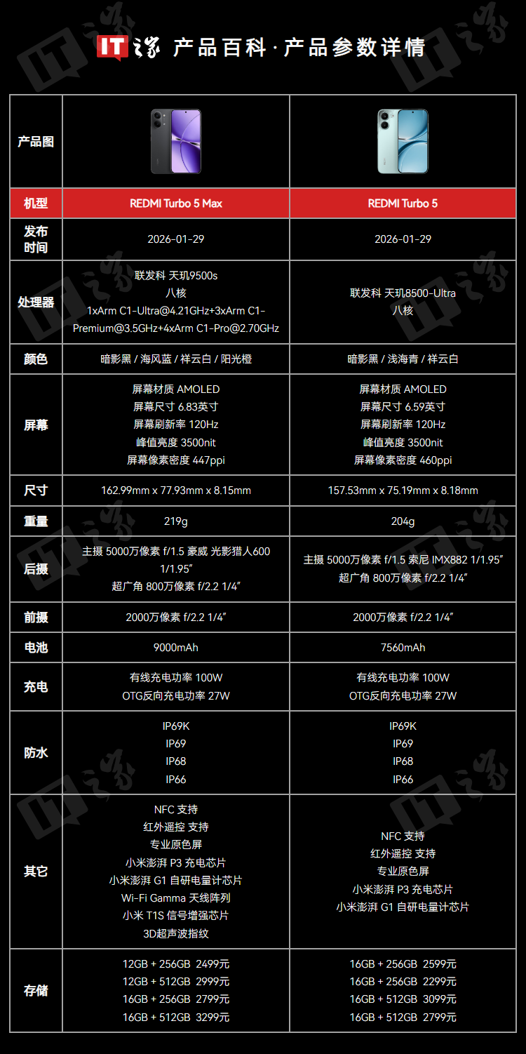 就在这样的市场背景下,REDMI Turbo 5 系列于 1 月 29 日正式登场。其中,REDMI Turbo 5 Max 全球首发“天玑 9500s”,并搭载了迄今为止最大的 9000mAh 小米金沙江电池。