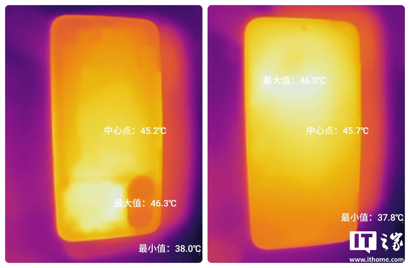 如图所示,30 分钟后,Turbo 5 Max 机身正面最高温达到了 46℃ 以上,背面最高温同样也在 46℃ 以上。