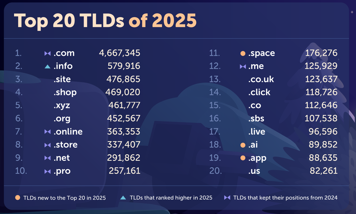 IT之家 1 月 30 日消息,全球第二大域名注册商 Namecheap 昨日(1 月 29 日)发布《2025 年域名洞察与趋势报告》,深入分析了 2025 年 1 月 1 日至 12 月 31 日期间注册的超过 2200 万个域名数据。