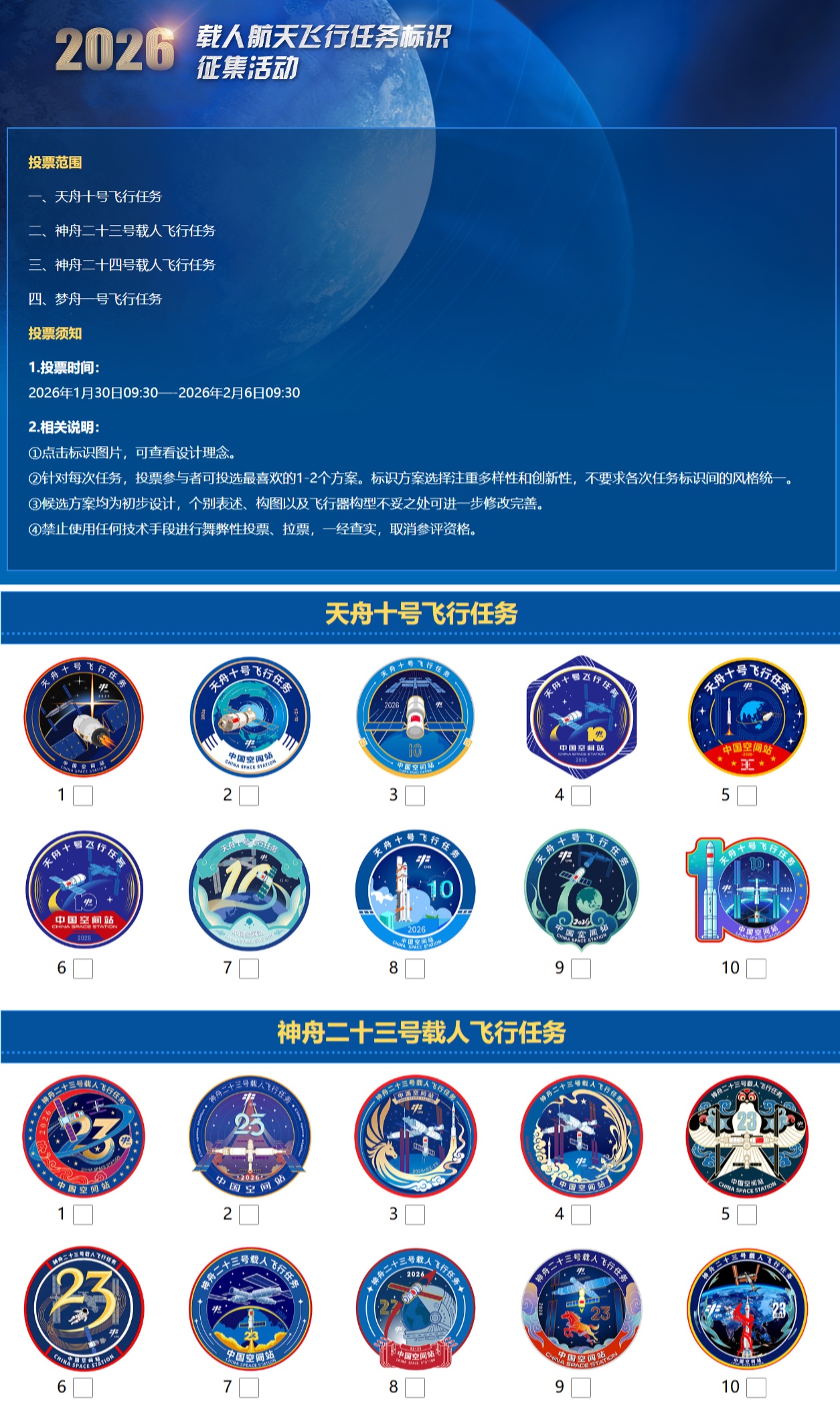 IT之家 1 月 30 日消息,中国载人航天工程办公室今日宣布,2026 年度载人航天飞行任务标识投票通道开启,投票时间为 2026 年 1 月 30 日 09:30——2026 年 2 月 6 日 09:30。