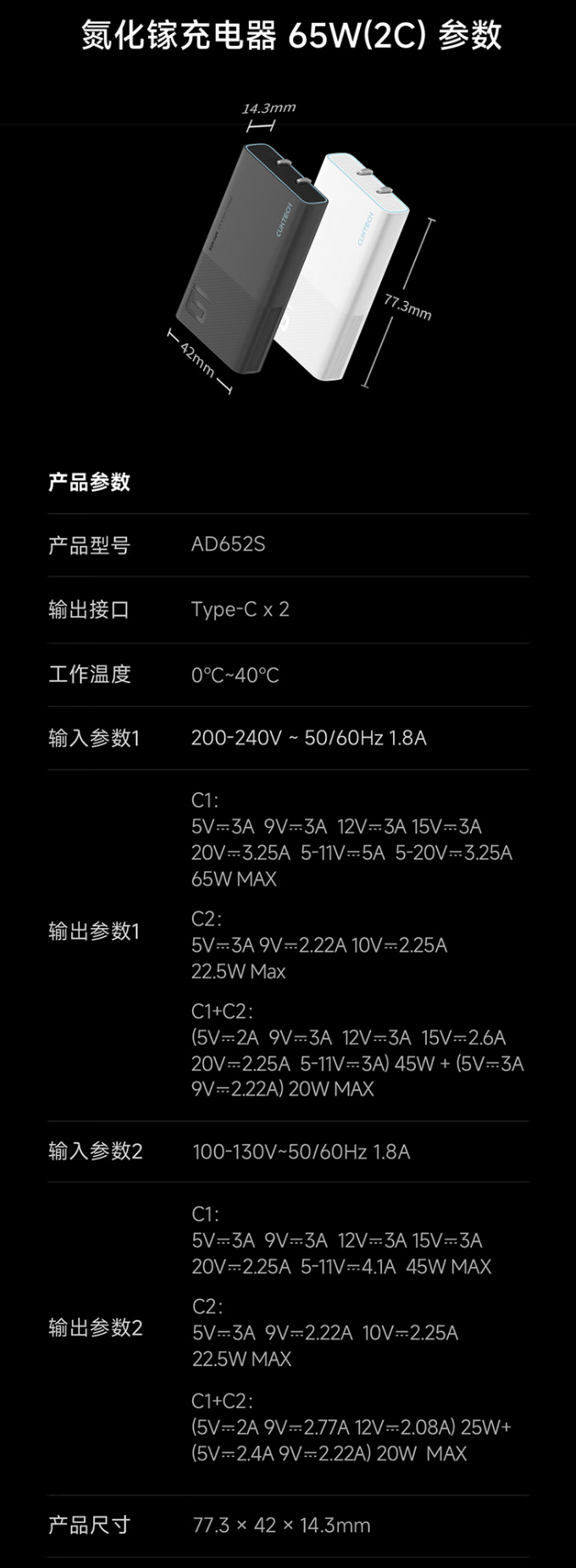 该产品整体尺寸 77.3 x 42 x 14.3 mm,采用 2C(65W + 22.5W)设计,支持 ADC 2.0 快充技术。