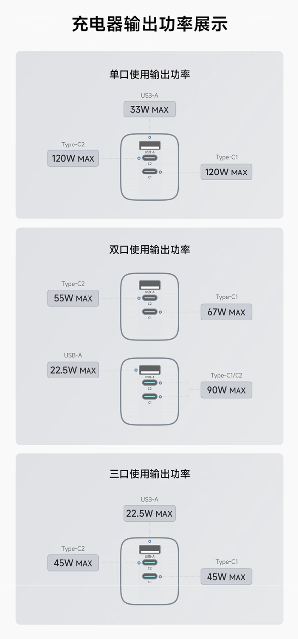 该产品整体尺寸 77.3 x 42 x 14.3 mm,采用 2C + 1A(120W + 120W + 22.5W)设计,兼容 PD、PPS 等协议,支持 ADC 2.1 快充技术,支持小米全系 120W MAX 澎湃秒充。
