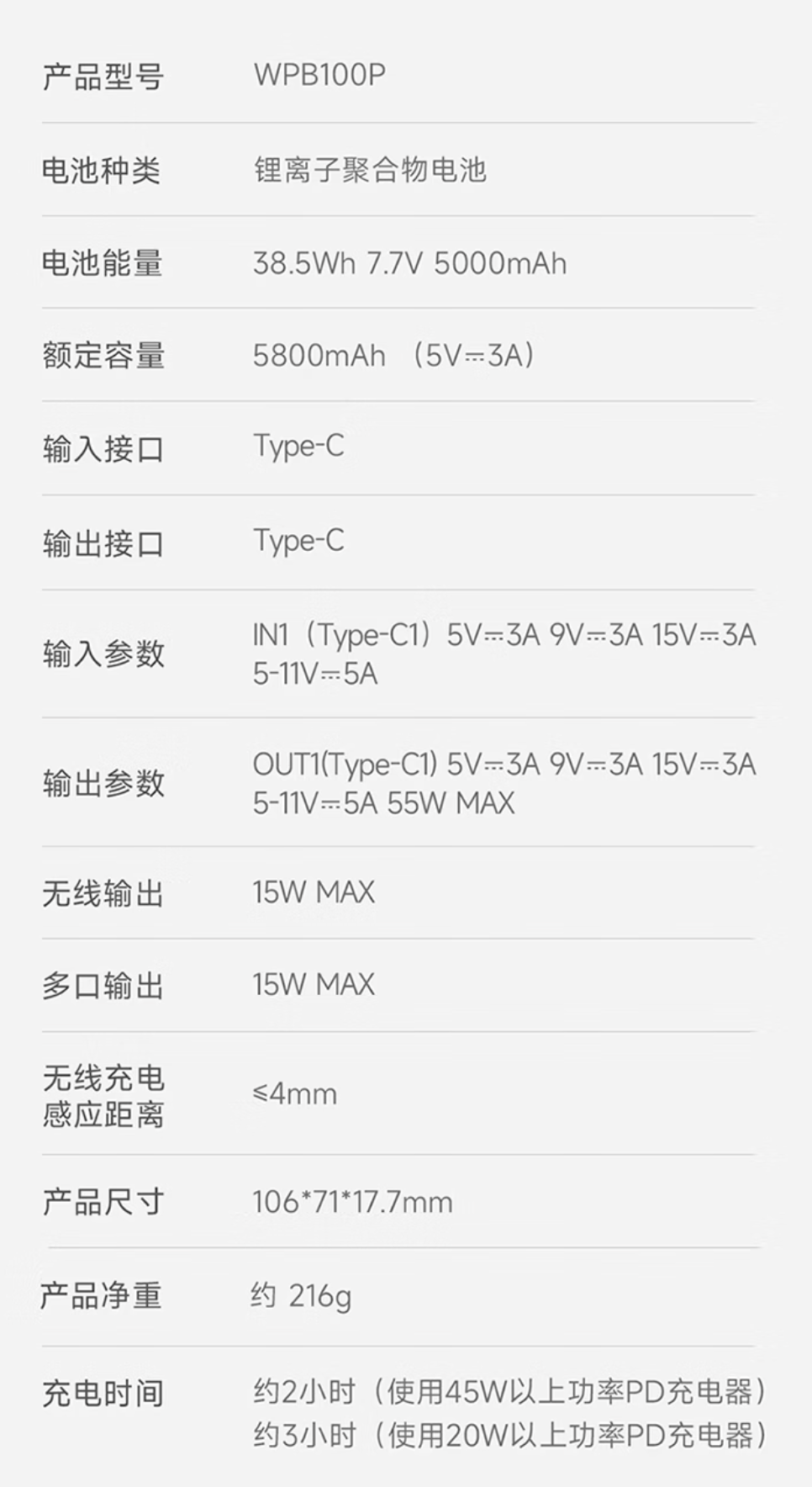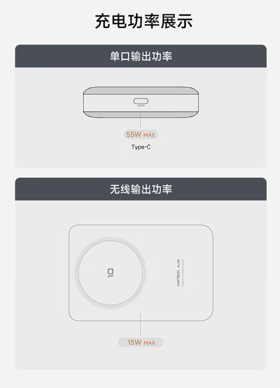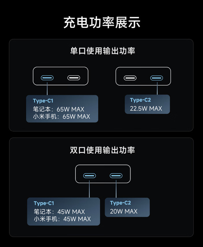 该产品支持无线 15W 充电,同时配备单个 USB-C (55W)接口,兼容 PPS、MIPPS、PD 等多种协议,支持小米至高 55W 澎湃秒充,手机在有线和无线同时接入充电时会优先选择有线快充模式。