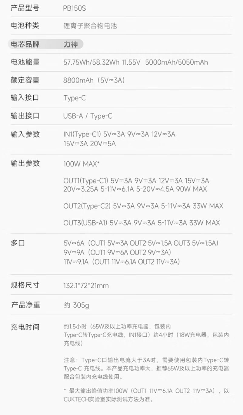 该产品整体尺寸 132.1 x 72 x 21mm,拥有 15000mAh 容量,产品配备彩屏,能够显示功率 / 电流 / 电压等多重实时数据。