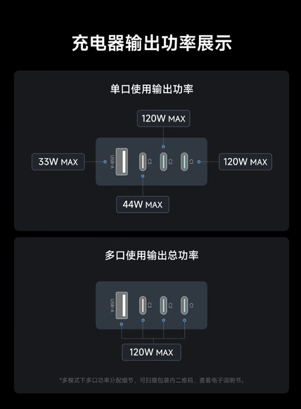 接口方面,该产品采用 3C + 1A 设计,兼容 PD、PPS、UFCS、SCP、FCP、QC 等协议,支持小米全系 120W MAX 澎湃秒充。