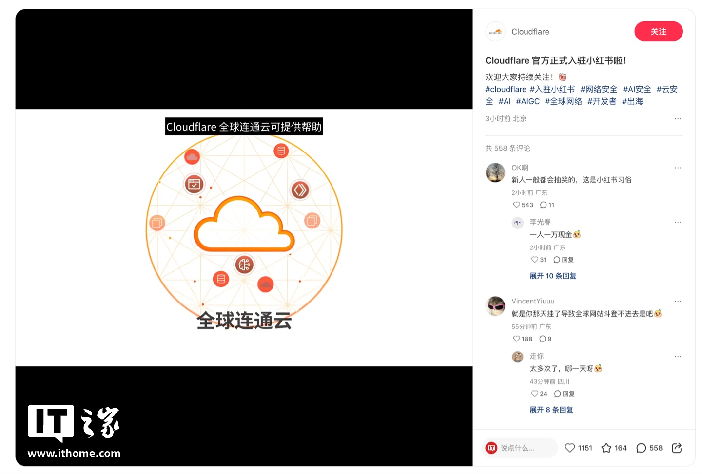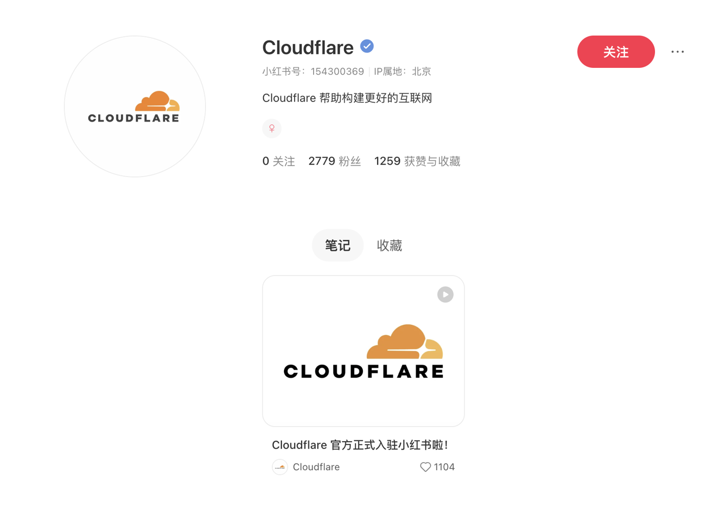 IT之家 1 月 30 日消息,Cloudflare 宣布入驻B站和小红书,认证显示为“Cloudflare 中国官方账号”,视频页显示相应账号主要服务出海开发者,截至IT之家发稿,其中 B 站粉丝数量为 864 人,小红书粉丝为 2779 人。