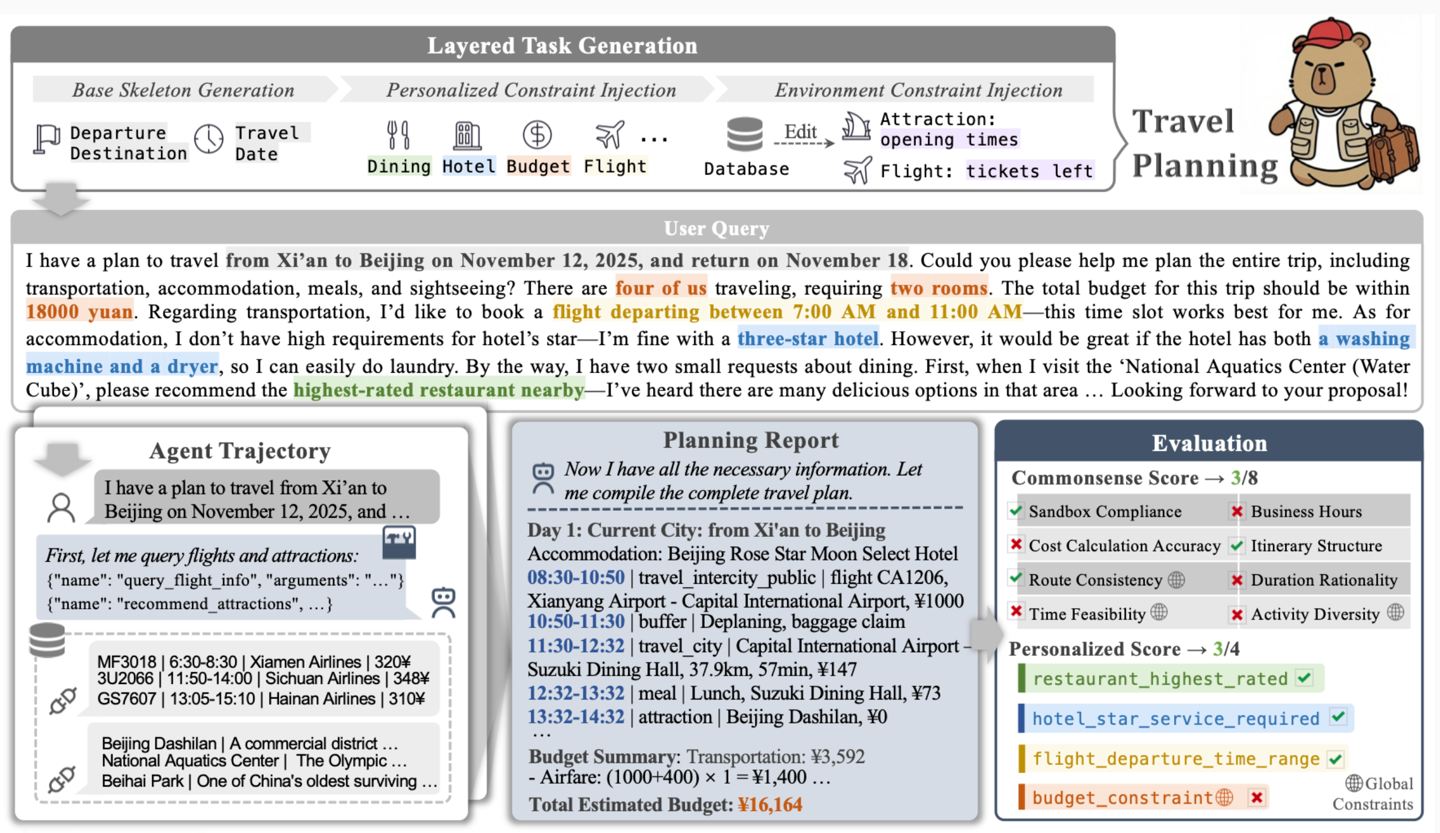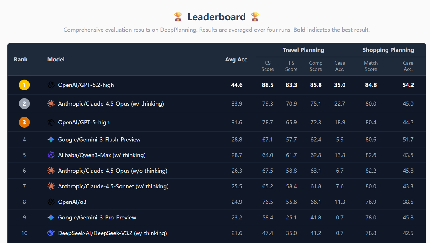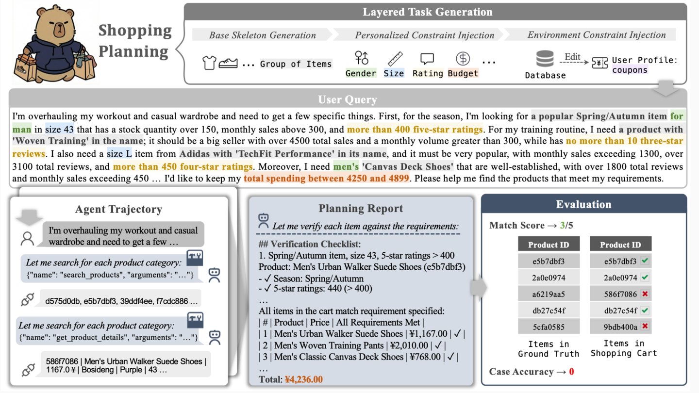 例如:多日旅行规划要精确到分钟级排期,同时守住时间、预算的硬上限;复杂购物场景要懂得叠加优惠券、知道如何动态组合商品才能满减,以实现整体价格最优。而且这些“硬要求”不只是让 AI 单纯在哪一步完成就好,必须贯穿整个计划始终。