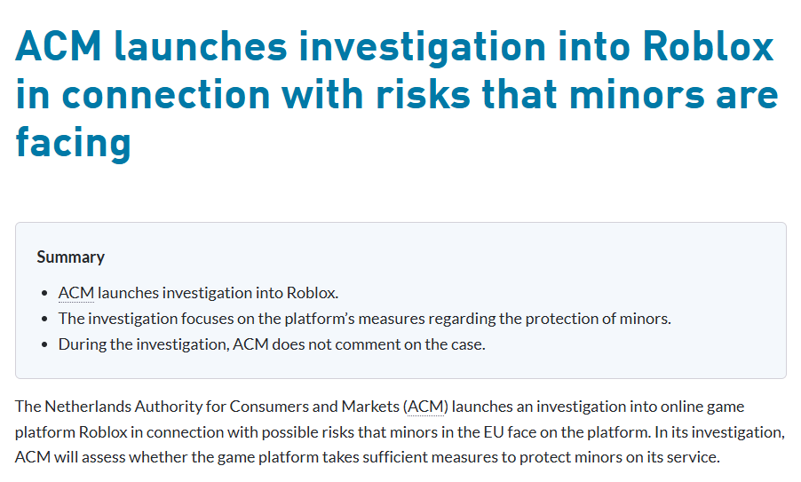 ACM 指出,罗布乐思平台在荷兰拥有大量儿童及青少年用户,现有报告显示该平台存在两项主要风险:
