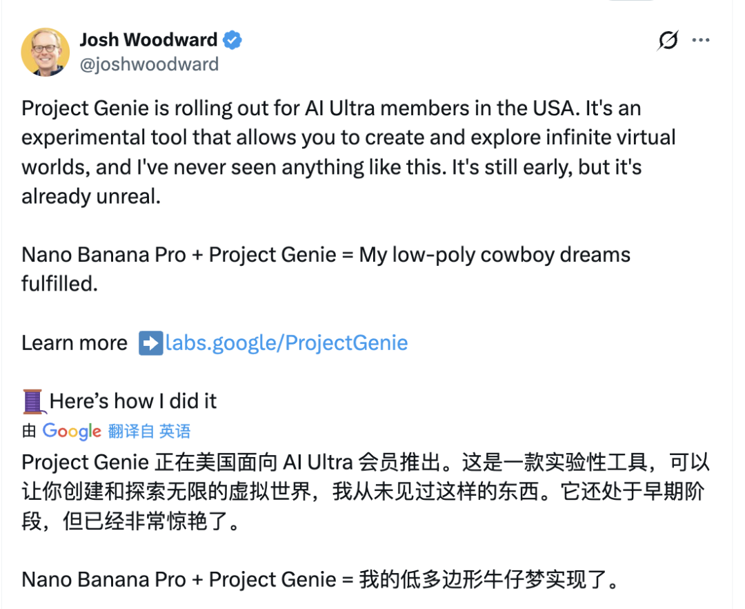 这不,谷歌自家高管 Josh Woodward,先在 Nano Banana 里生成了一个自己的卡通牛仔形象,再丢进 Project Genie,直接让自己摇身一变,成了赛博世界里的西部牛仔~