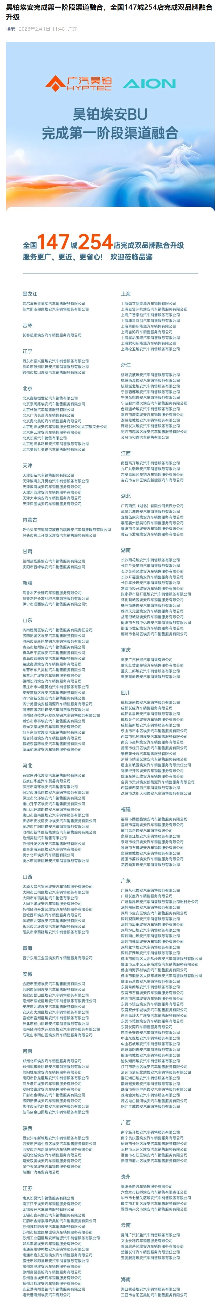 IT之家 2 月 1 日消息,广汽集团今日宣布昊铂埃安完成第一阶段渠道融合,全国 147 城 254 店完成双品牌融合升级。