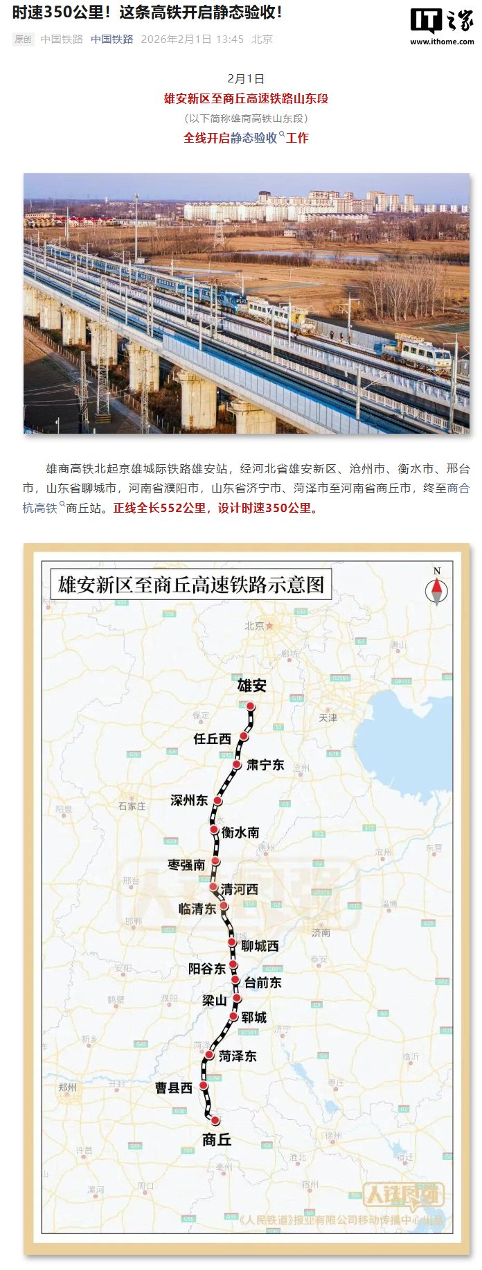 IT之家 2 月 1 日消息,据“中国铁路”官方公众号,今日,雄安新区至商丘高速铁路山东段(IT之家注:以下简称雄商高铁山东段)全线开启静态验收工作。