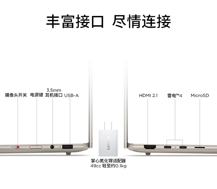 其他方面,该机提供了一个 2242 M.2 SSD 插槽,内置 70Wh 电池,续航约 26 小时,厚 13.9mm,重 1.28kg,配备 8W 高低音分频四扬声器,提供了双雷电 4、HDMI 2.1、MicroSD、USB-A、3.5mm 接口。